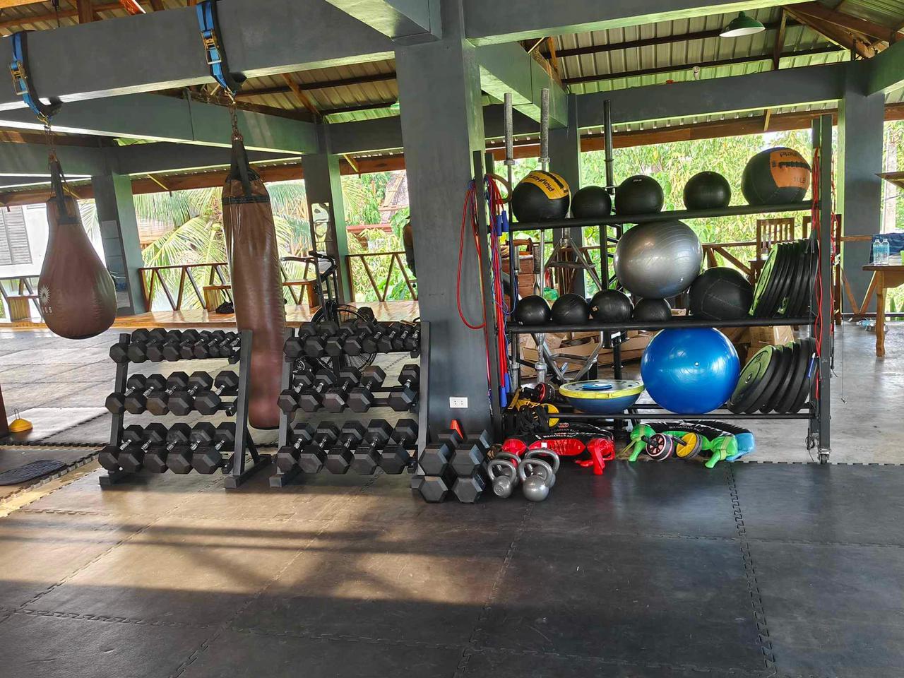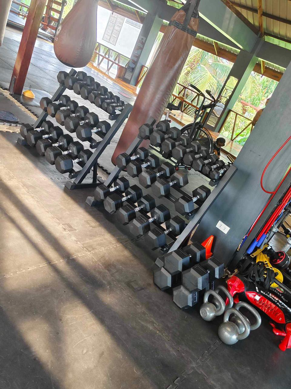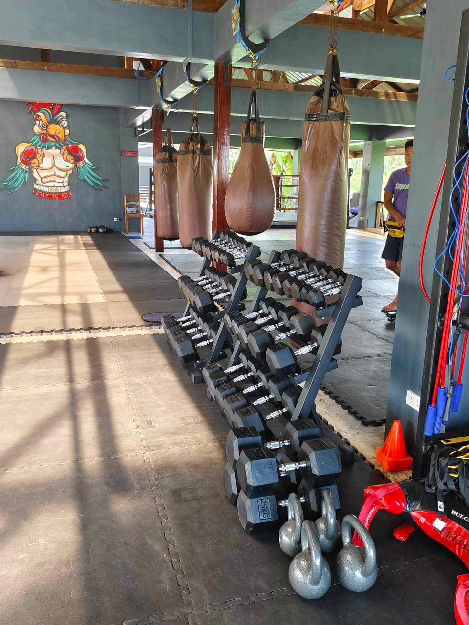 Flooring, attachments, battle ropes, and boxing gear.